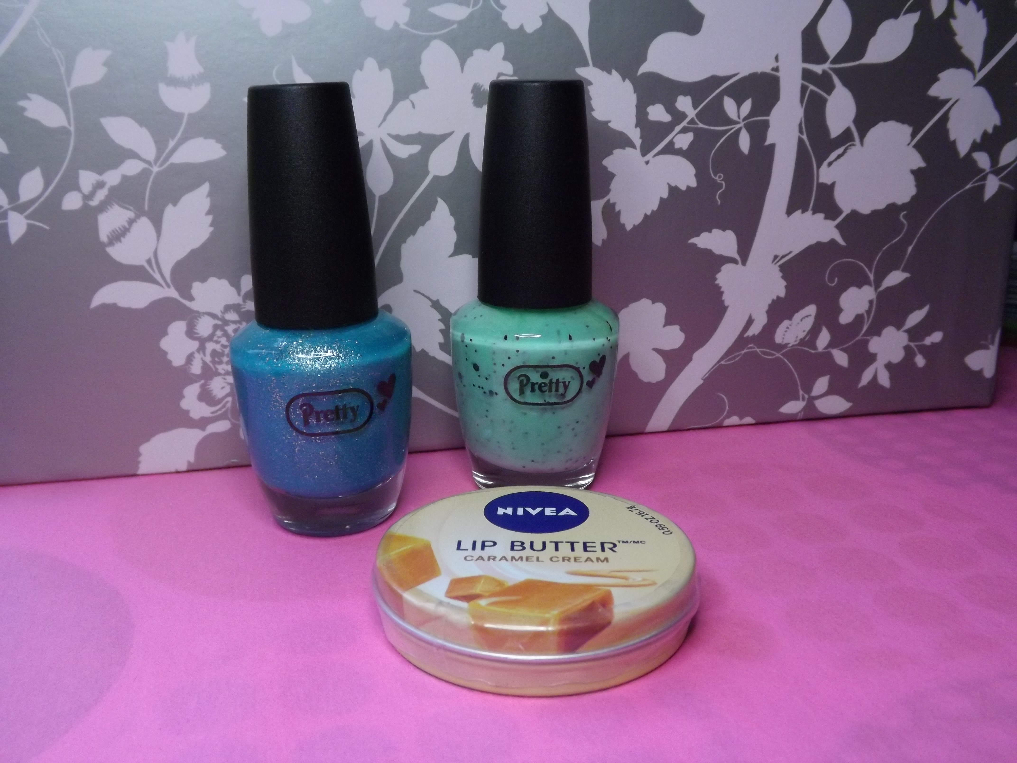 Now I have found quite a few bargains in pound stores, such as OPI Shatters and Sally Hansen Complete Salon Manicures. Failing the choice of some nice name brands I will poke through the bargain basement polishes and today I picked up two Pretty polishes, one is a concrete effect and the other is a scatter effect. (Plus a little yummy Nivea lip butter! 🙂 )