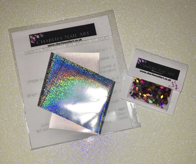 The first item is a strip of holographic nail foil. I’ve had mixed experiences with nails foils but Charlie has kindly added some instructions and tips on the back of the pack for those of you who haven’t tried them before. I had success with this foil and found it transferred to the nail well.