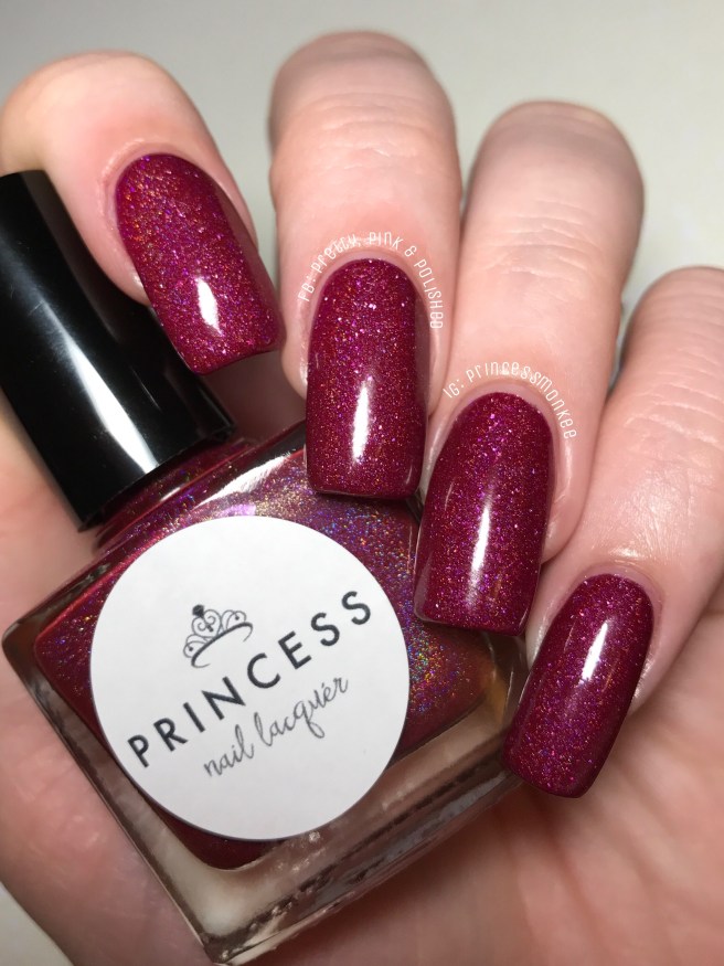 Hello again! I promised a look at another beautiful Princess Nail Lacquer collection and here it is. This is the Bitten Trio, three gorgeous, deep and dark holographic polishes. Now I have never been the type of person to follow seasonal nail polish styles too closely. If I want to wear a hot pink in December and a vampy black in July then I will! This collection calls to those of us who fish around in the drawer for something deep and moody whilst the rest of the world is wearing pastels and neons (and sunglasses, those neons are bright!).
