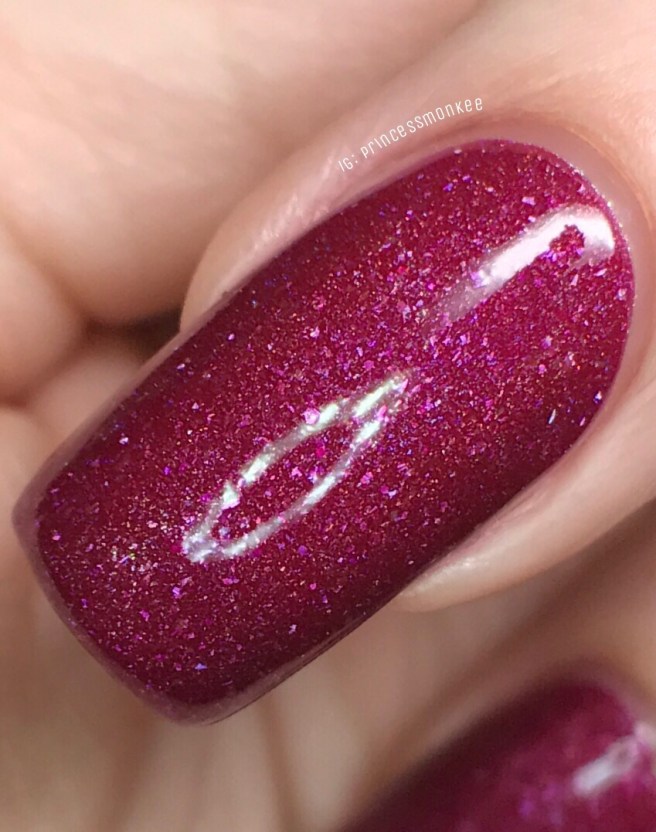The last polish of the trio is called ‘Love Bite’, a dark pink/deep fuchsia linear holo with holo flakies. Like ‘Pick Your Poison’, the flakies really stand out in this polish which gives it a lovely depth which is quite stunning. Once more, one coat on shorter nails would do fine but two coats is where it’s at. Plus my nail OCD likes two coats! 🙂