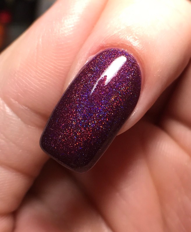 The first of the trio is ‘Bitten’, a deep berry/wine linear holo. This is very eye-catching, deep and sultry one moment, but then it dances when the sunlight hits it. This would cover well in one coat on shorter nails but two coats gives a stronger depth of colour.