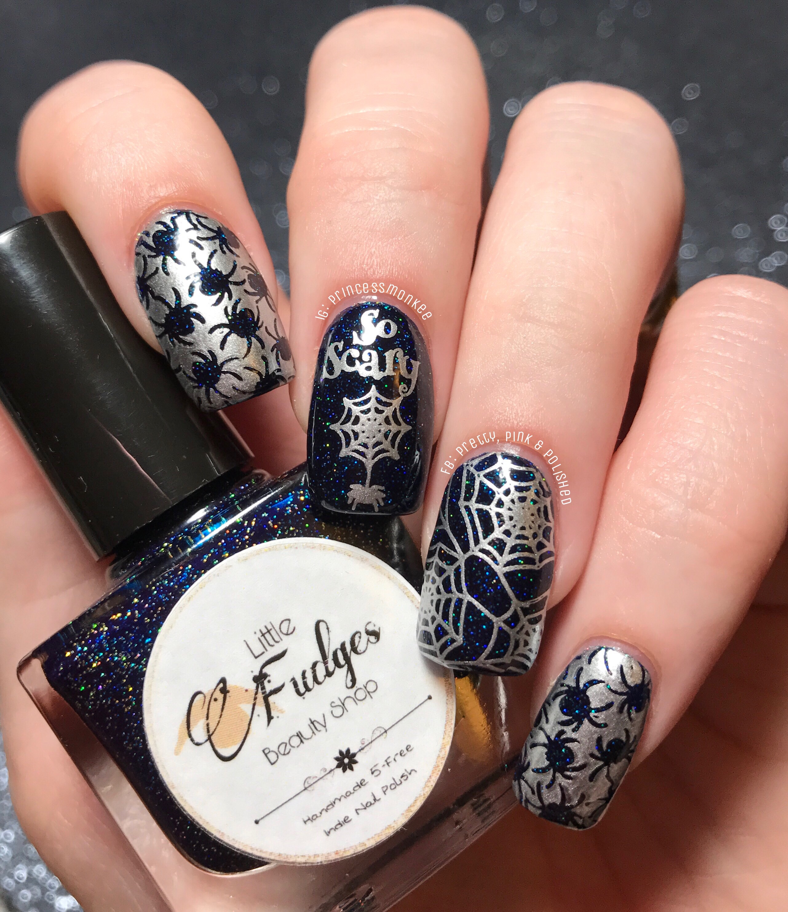 his was ‘Lemuralia’ stamped using Barry M ‘Silver Foil’ and UberChic Halloween plate 02 and Lina Spookilicious plate for the dangling spider. This polish would also be perfect as the base of a space themed mani.