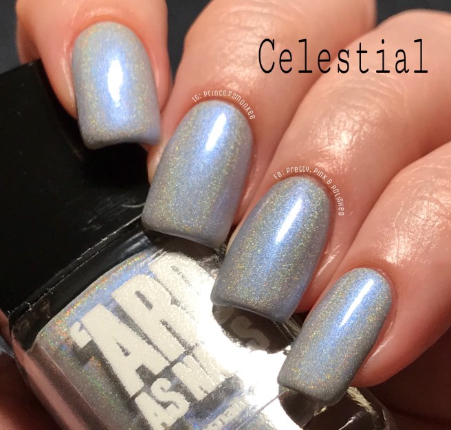 Next up is “Celestial”. This has a vibrant blue shimmer which, due to the grey base, seems to give a tiny bit of a blue tinge to the polish overall. This is not a bad thing however as Celestial is gorgeous.