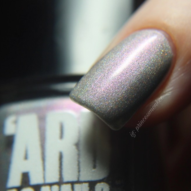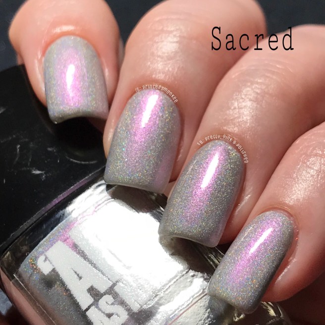 The first polish in the trio is “Sacred”. The grey holo base holds a violet shimmer and is just wow!