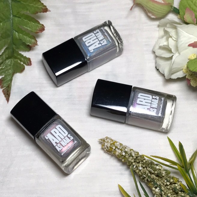 Today I have The Ethereal Collection from ‘Ard As Nails, which is a pretty trio of polishes. They are a grey holo base, each with a different coloured shimmer. This collection is perfect for the transition into spring, the delicate hues remind me of those first splashes of colour from the growth of new flowers. They would be great as the base for some stamping or nail art and stamp beautifully too, although better over darker colours to show the shimmer.