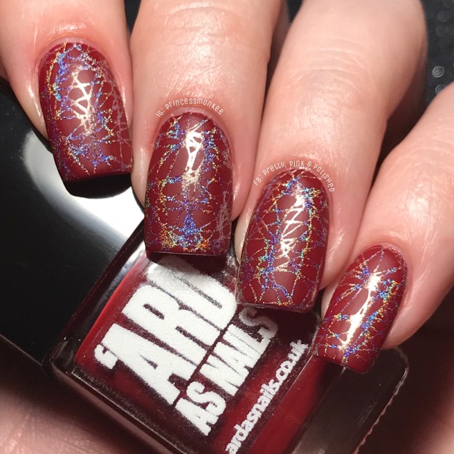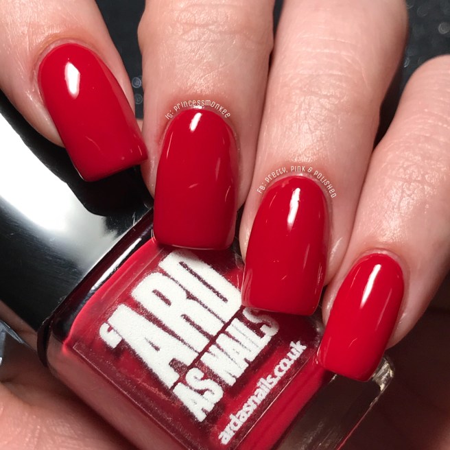 Another red, but this time a glossy, pillar-box red that is called “El Chupa O+”. This was imagined by @daddy_long_nails. This beauty was another easy, one-coater. This is another “me” red. I like it blood or pillar-box and this doesn’t disappoint! It is very glossy on it’s own but I added top coat, cos I’m weird like that…