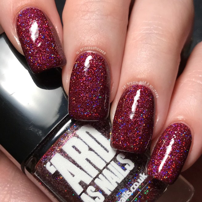This little glitter-bomb is “Yaaaaasss” and was a collaboration with Devon, @polishhisnails. This polish is a deep, berry coloured base packed with holo glitter. This is a party for your nails, which, if you have seen the false nails that Devon creates for others, is spot on and would fit in nicely with some of his creations. I used two coats and two coats of top coat for these pictures.