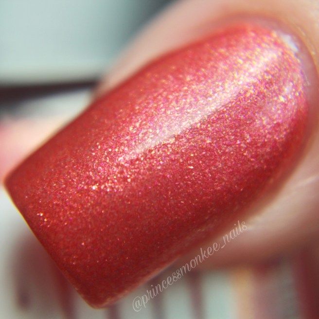 Up next is the beautiful “Coral Reef”. One second this looks mid-pink, the next, bright coral. This would be perfect for some summer nail art 🙂 The shimmer in this looks silver, gold and pink. It is also a little lighter than shown here but it made my camera a bit crazy!
