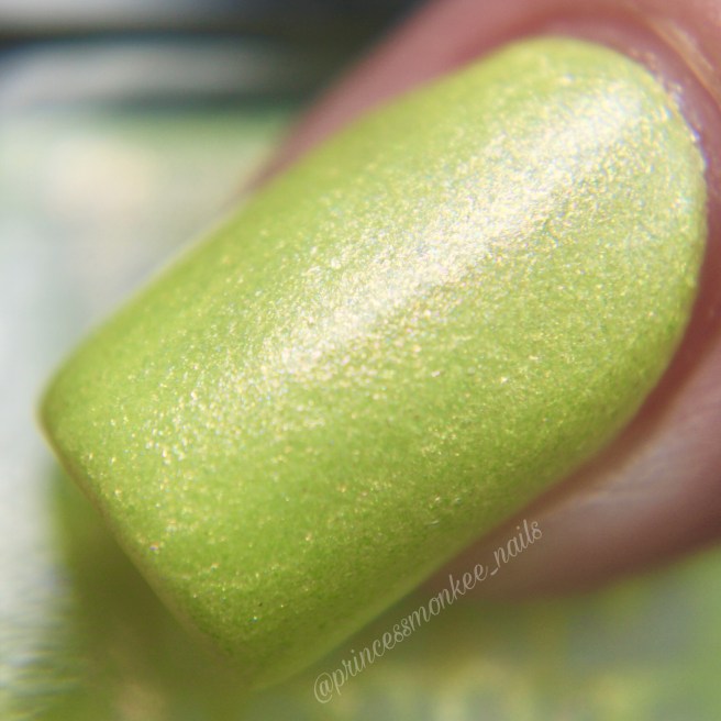 First up is “Sunset Shimmer”, a lovely bright yellow polish which looks more chartreuse in certain lights. This was the first out of the box and got a big “Ooooooh!” from me. The shimmer in this looks silver and gold depending on the angle, so pretty!