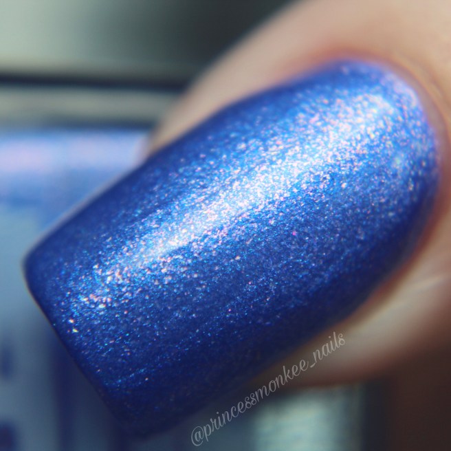 The next polish is called Sapphire Sparkles. This has a bit more of a purple tone than is shown here but, in typical blurple style, it’s a bit camera shy. The shimmers in this polish look gold and pink.