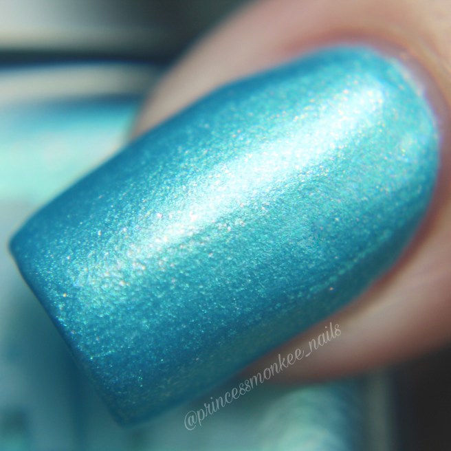 The last of the collection is “Mermaid Scales” a beautiful icey blue, almost cyan polish. This makes me think of beautiful clear waters surrounding a desert island *sigh* and the shimmer in this looks silver gold and pink.