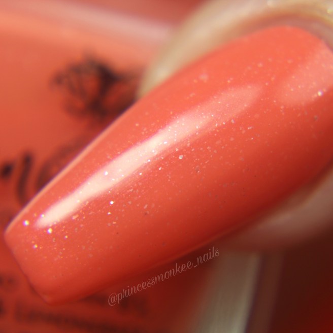 The next polish is ‘Sunkissed’, a bright coral creme with pink to gold shimmer. I loved that this was included as it’s not a typical autumn/winter colour. This is more of a holiday abroad in October colour and it’s just stunning. Shown is two coats and top coat.