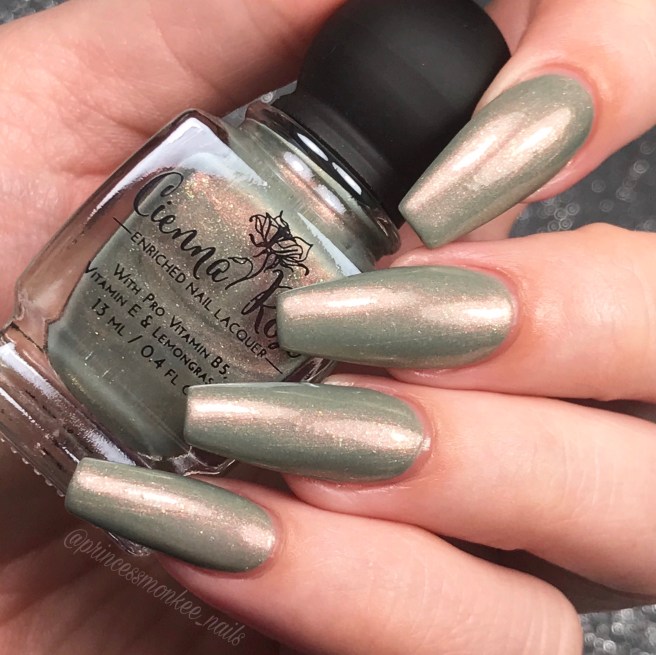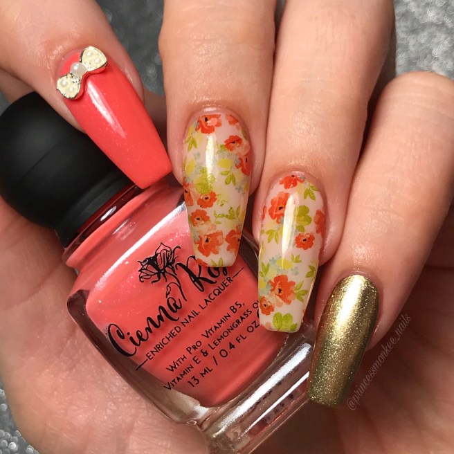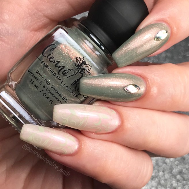 I did some nail art using this and one coat of ‘So Haute’ (another polish from Cienna Rose) over the top of my index and pinky fingers. Stamping is using ZJoy stamping polish and UberChic Deco Chic plate.