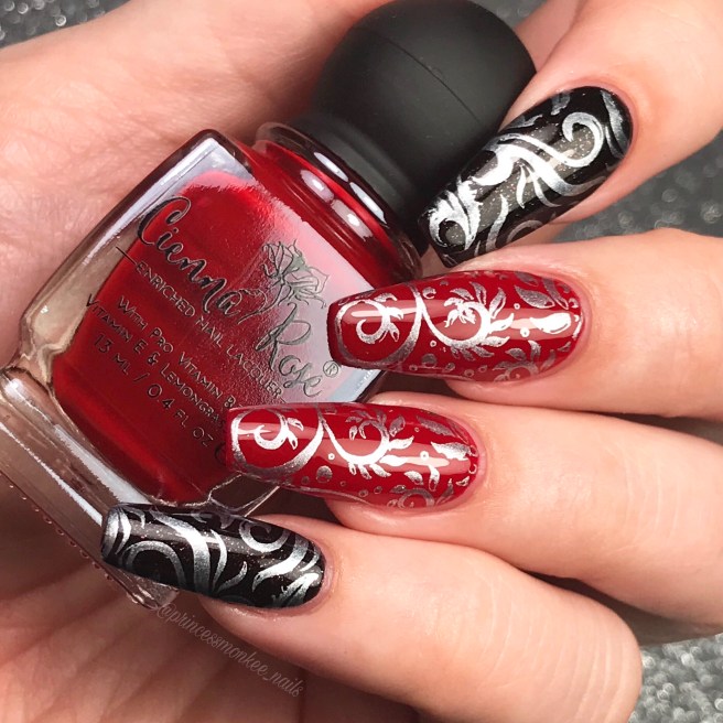 I teamed this with another Cienna Rose Polish, ‘Black Diamond’ and stamped then both with ‘Kylo Ren’ by Esmaltes da Kelly and UberChic plates 4-02 and 24-03.