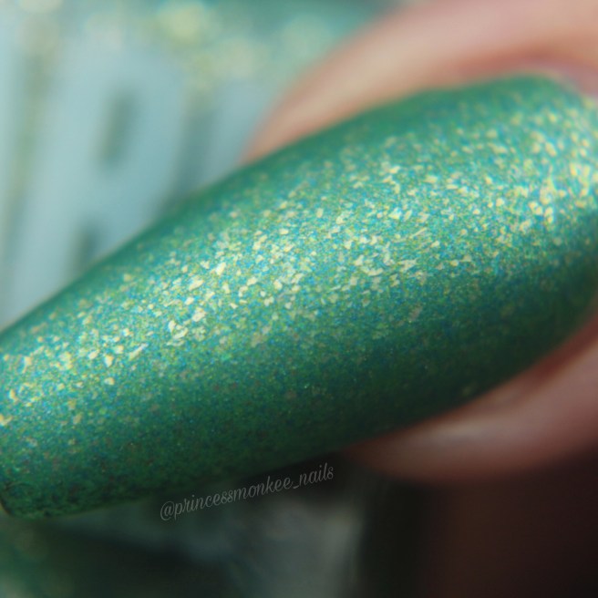 The final polish in the trio is based on The World’s End and is called ‘The Golden Mile’. Somewhere between a Russian and Hunter green, it represents the extraterrestrial aspect of the film. It also has gold flakes, added to represent The Golden Mile, the pub crawl from the film in which Pegg and Frost (and Martin Freeman, Paddy Considine and Eddie Marsan) attempt to drink at every pub in their home town in the midst of an alien invasion. As a bonus, although there are no blue flakes in the polish, in certain lights/angles it looks as if it has blue flecks which I think ties in nicely with the blue blood of the invading aliens!