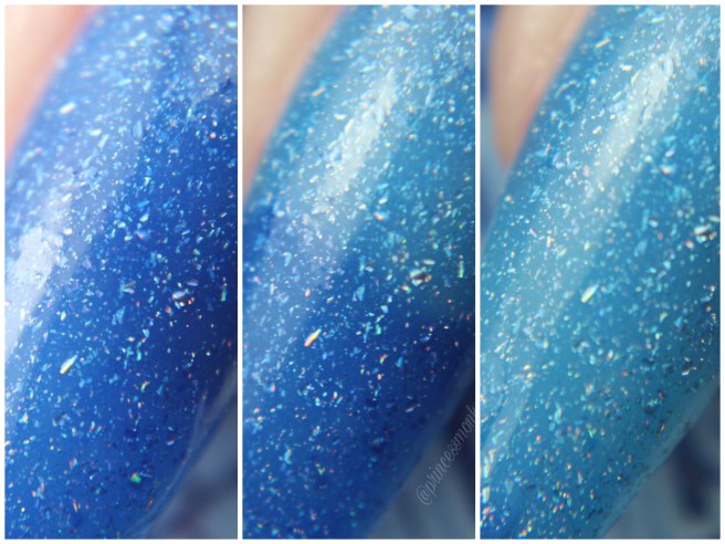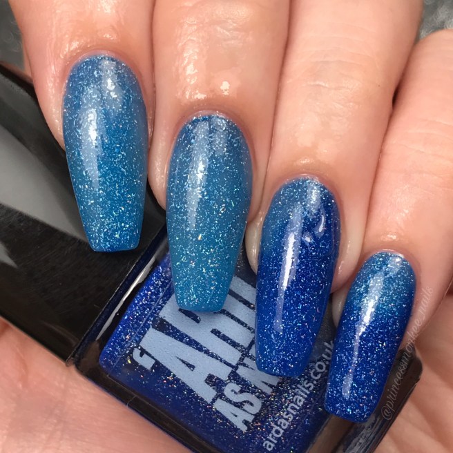 The second polish in our trio is called ‘Mornin’ Angle’ and is inspired by the film Hot Fuzz. My husband and I are one of those really sad (super cool) nerdy couples who go around quoting lines from films/TV shows/memes to each other all day, so when I thought of Hot Fuzzz this was the first line that popped into my head! The blue colour of this polish/film is taken from it being based on the police service of Sandford, Gloucestershire. I asked Kat to make it a police blue which the changes to a mid-blue (more like the ice cream colour) when warm. Thermal polish, yay! It also has tiny silver flakes in it which remind me of the bage on the police helmets.