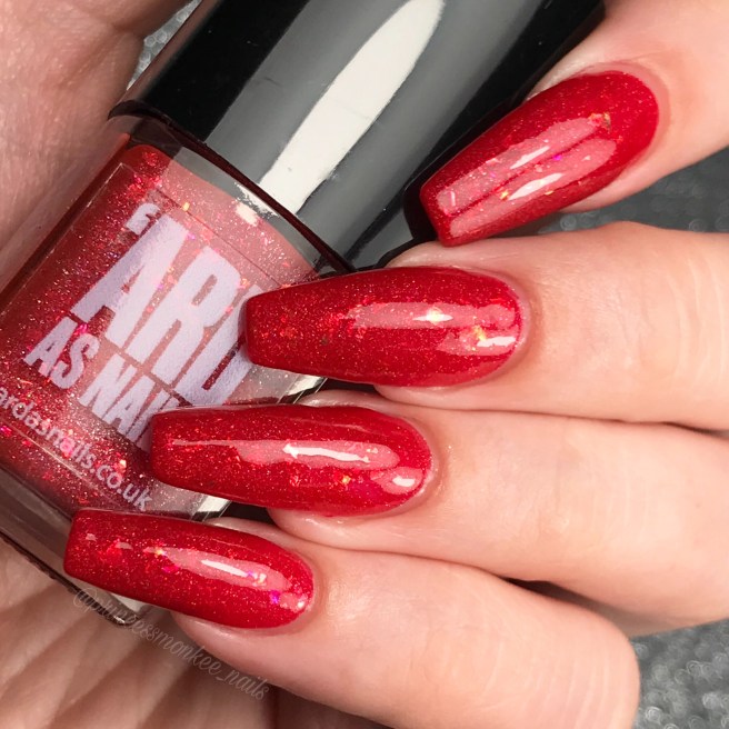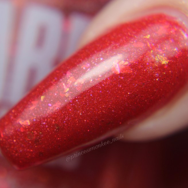 First up, of course, is a polish inspired by Shaun of the Dead and is called ‘You’ve Got Red on You’. This is one of my all-time favourite zombie movies! The red comes from the blood and gore of the film; in the polish it’s represented by a red jelly base which is then full of colour change flakes and a sprinkling of holo.
