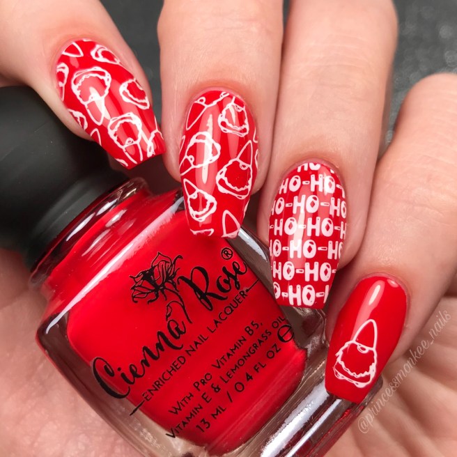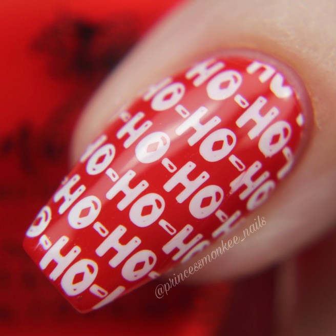 Obviously I had to team it with white for a proper Christmas mani, the little Santa gnomes from UberChic’s ‘Holly Jolly’ stamping plate are just adorable!