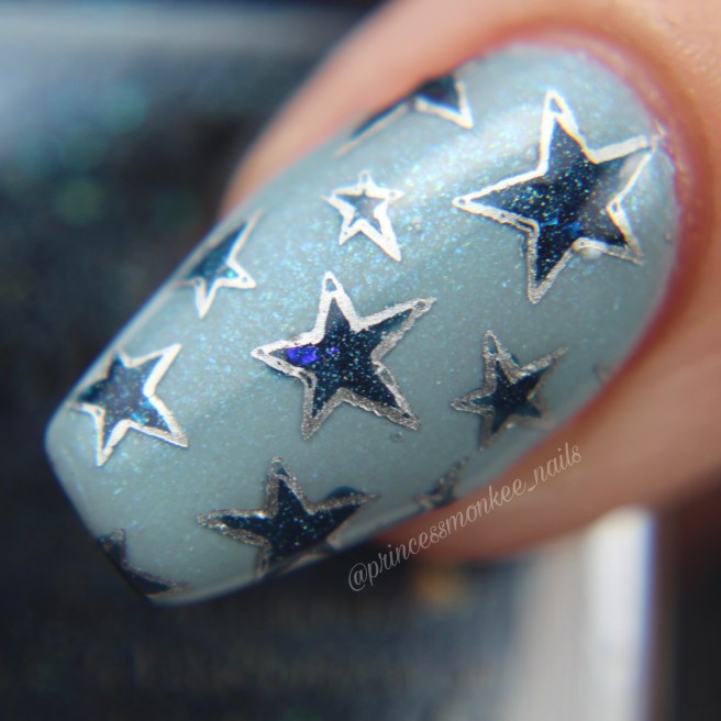 So the nail art just HAD to be star themed! I used another Cienna Rose polish, ‘Something Blue’, to make star decals (I used Lina ‘Make Your Mark 02’ stamping plate). I think that they go very nicely together 🙂