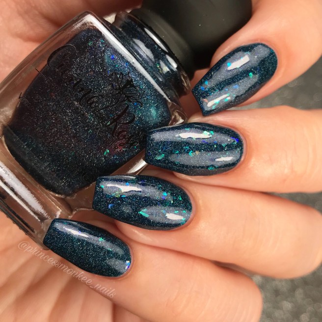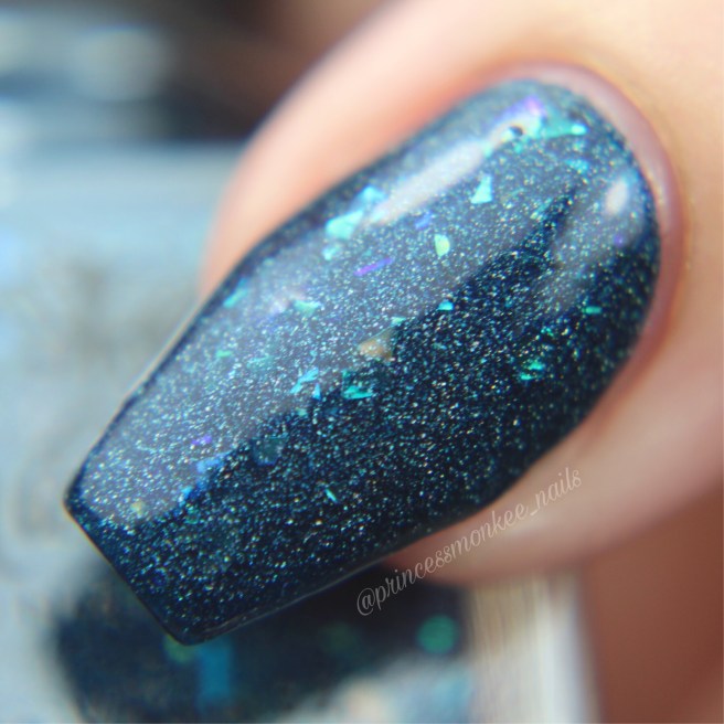 Next up from the Trio is ‘Under the Stars’, a deep and inky blue base full of shimmer, scattered holo and multichrome flakes. This would make for a beautiful galaxy mani! It make me think of the sky at midnight on New Year’s Eve…