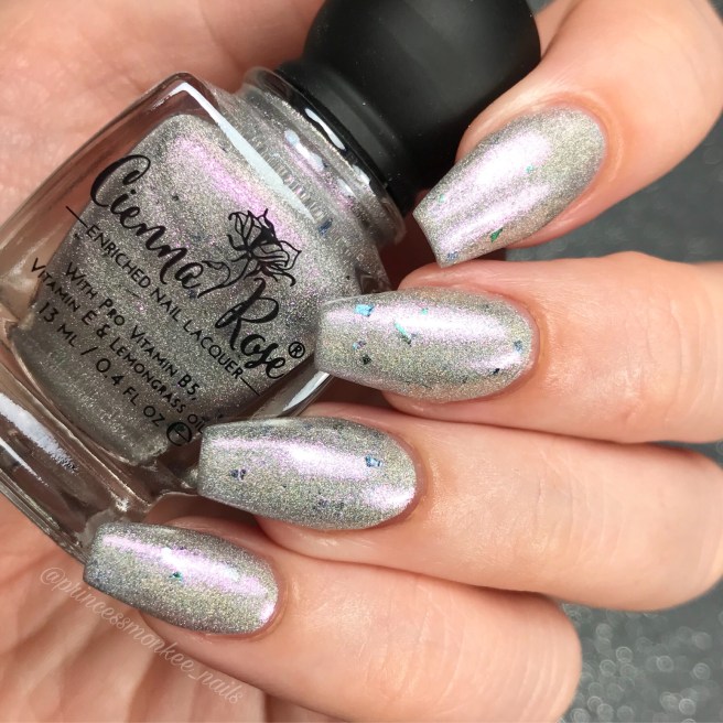 The last polish in the Christmas Trio is a limited edition polish, ‘Tiara’. This is a stunning silver ethereal polish with a striking violet shimmer and purple to blue to green flakes. It covered perfectly in two coats.